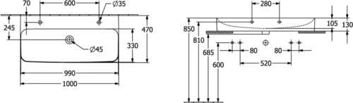 Villeroy & Boch Finion wastafels, zonder overloop, 2 kraangaten, onderkant gepolijst, 1000x470mm