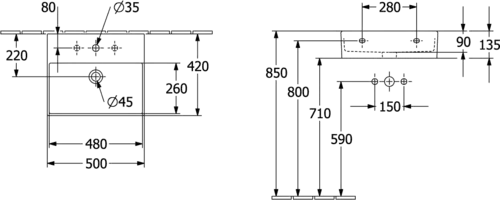 Villeroy & Boch Memento 2.0 wandwastafel, 1 kraangat, met overloop, ongepolijst, 500x420mm