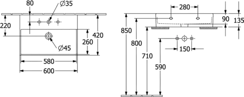 Villeroy & Boch Memento 2.0 wandwastafel, 1 kraangat, zonder overloop, gepolijst, 600x420mm