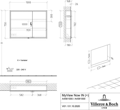 Villeroy & Boch My View Now spiegelkast, 2 deuren, met verlichting, met sensordimmer, 1000x750x167,5mm