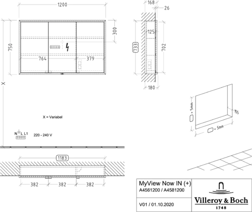 Villeroy & Boch My View Now spiegelkast, 3 deuren, met verlichting, met sensordimmer, 1200x750x167,5mm