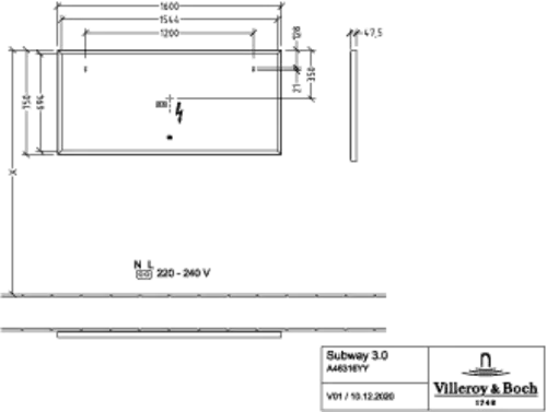 Villeroy & Boch Subway 3.0 spiegel met LED verlichting, rechthoekig, 1600x750x47,5mm