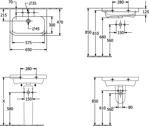 Villeroy & Boch Architectura wastafels, rechthoekig, 1 kraangat, met overloop, 650x470mm