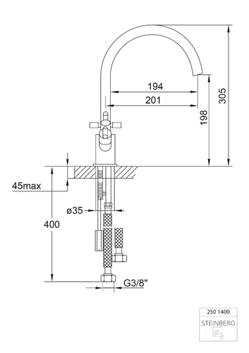 Steinberg Serie 250 Küchenarmatur, Zweigriff, schwenkbar, Ausladung 201 mm