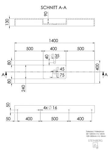 - Maße (BxTxH): 1400 x 400 x 130 mm
