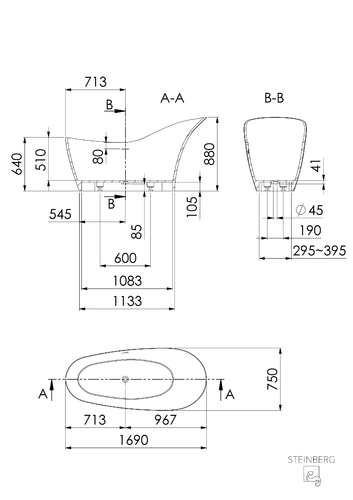 Steinberg Serie 490 Badewanne, freistehend, oval, 1690x750mm, SOLIDSurface, Mattweiß
