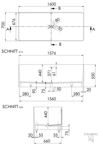 Steinberg Serie 490 Badewanne, freistehend, rechteckig, 1600x700mm, SOLIDSurface, Mattweiß