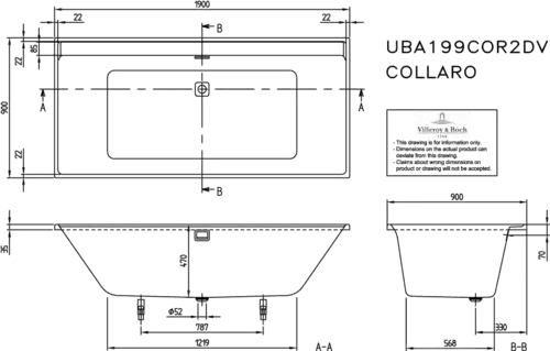 Villeroy & Boch Collaro Duo Rechteck-Badewanne, Einbau, Ab- und Überlauf Black Matt, 1900x900x470mm