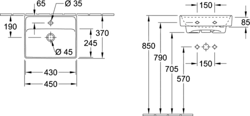 Villeroy & Boch Collaro Handwaschbecken, 1 Hahnloch, ohne Überlauf, ungeschliffen, 450x370mm