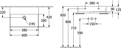 Villeroy & Boch Memento 2.0 lavabo mural, sin agujero para grifo, sin rebosadero, pulido, 600x420mm