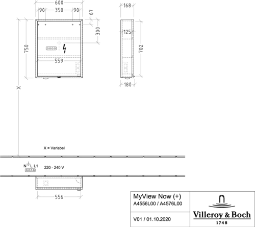 Villeroy & Boch My View Now armoire de toilette apparente, 1 porte, charnières à gauche, avec éclairage, avec variateur à détection, 600x750x168mm