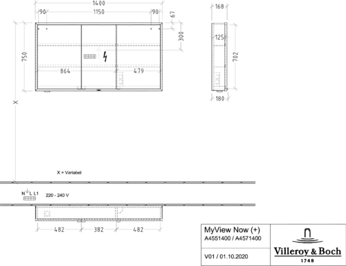 Armadietto a specchio My View Now di Villeroy & Boch, 3 porte, con illuminazione, con interruttore on/off, compatibile con Smart Home, 1400x750x168mm