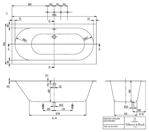 Villeroy & Boch Oberon Rechteck-Badewanne, Einbaumontage, 1900x900x505mm