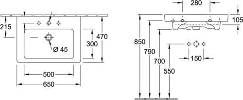 Villeroy & Boch Subway 2.0 Waschtisch, mit Überlauf, 1 Hahnloch, Unterseite geschliffen, 650x470mm