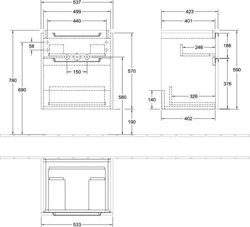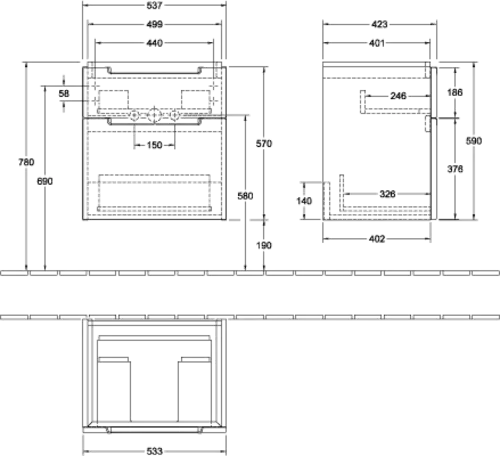 Villeroy & Boch Subway 2.0 Waschtischunterschrank, 2 Auszüge, Waschbecken mittig, 537x590x423mm
