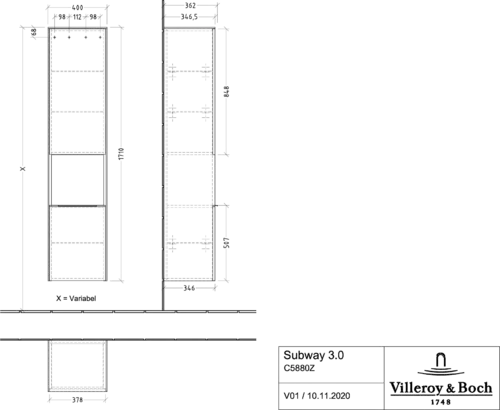 Villeroy & Boch Subway 3.0 Hochschrank, 1 offenes Fach und 2 Türen Anschlag links, 400x1710x362mm
