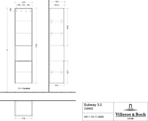 Villeroy & Boch Subway 3.0 Hochschrank, 1 offenes Fach und 2 Türen Anschlag rechts, 400x1710x362mm
