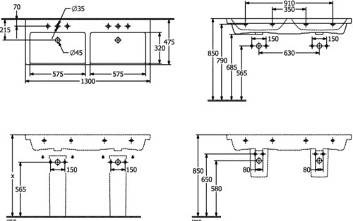 Villeroy & Boch Subway 3.0 Schrank-Doppelwaschtisch, 2 Hahnlöcher, ohne Überlauf, ungeschliffen, 1300x475mm