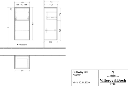 Villeroy & Boch Subway 3.0 Seitenschrank, 1 Auszug und 1 Tür Anschlag rechts, 400x860x362mm