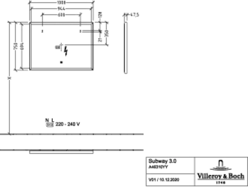 Villeroy & Boch Subway 3.0 Spiegel mit LED-Beleuchtung, Rechteck, 1000x750x47,5mm
