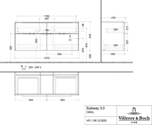 Villeroy & Boch Subway 3.0 Waschbeckenunterschrank, LED-Beleuchtung, 4 Auszüge, Waschbecken mittig, 1272x576x478mm