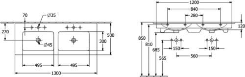 Villeroy & Boch Venticello Schrank-Doppelwaschtisch, 2 Hahnlöcher, mit Überlauf, 1300x500mm